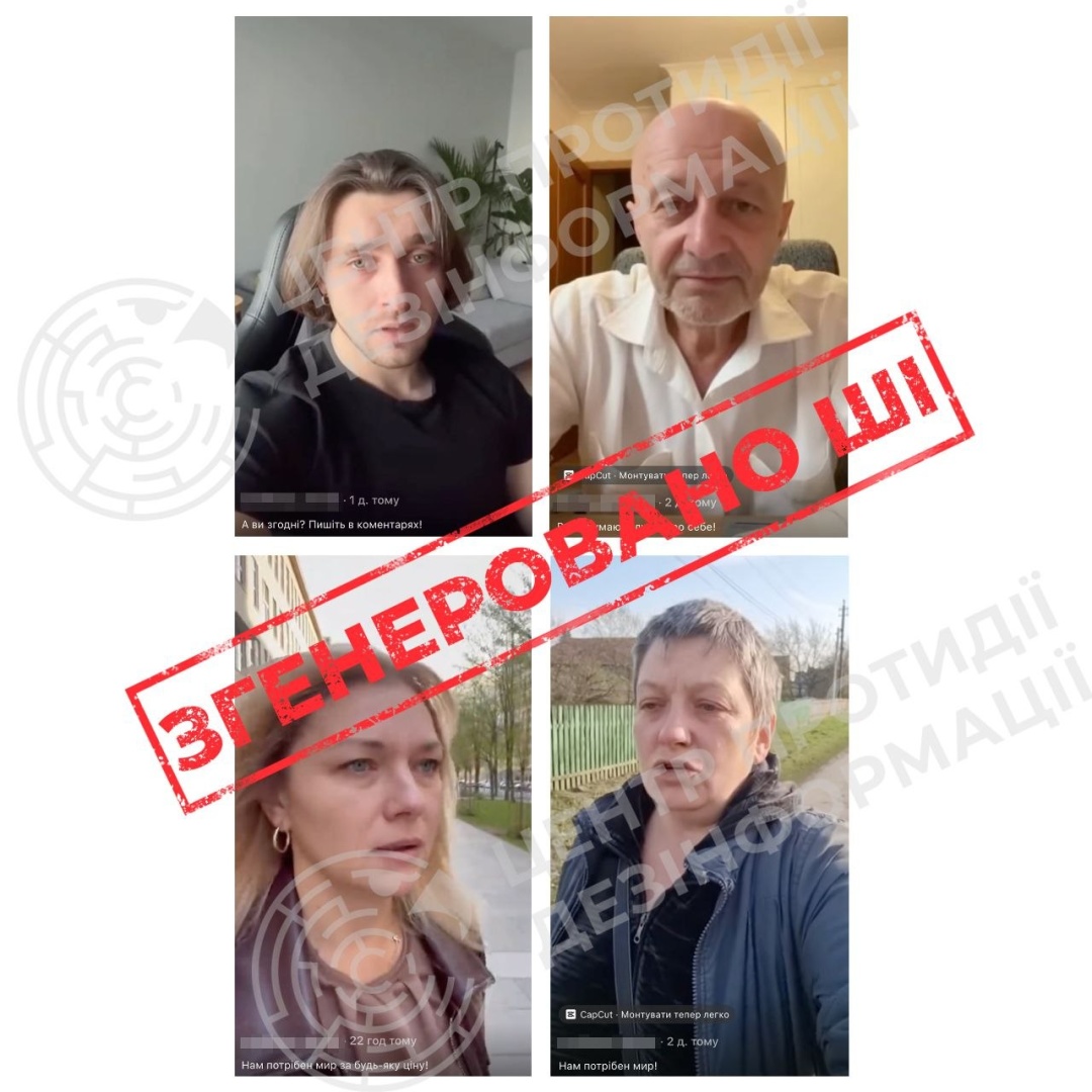 У Центрі зазначили, що ворожа пропаганда випустила нову хвилю відео, створених за допомогою штучного інтелекту. Ролики виконані у форматі селфі-монологів: у них персонажі, здебільшого зображені як українці за кордоном, висловлюють розчарування та просувають ідею територіальних поступок на користь Росії.